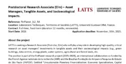 Stratégie d’investissement, enjeux écologiques et transformations de l’espace Référence : FinPlanet_3.4_StageLieu : Laboratoire Techniques, Territoires et Sociétés (LATTS), Université Gustave Eiffel, FranceContrat : Stage à temps plein, de 4 à 6 mois, rémunéré selon grille en vigueur.Date de début : 1er semestre 2026 Date de candidature : 15 décembre 2025 Contacts : Félix Adisson et Ludovic…