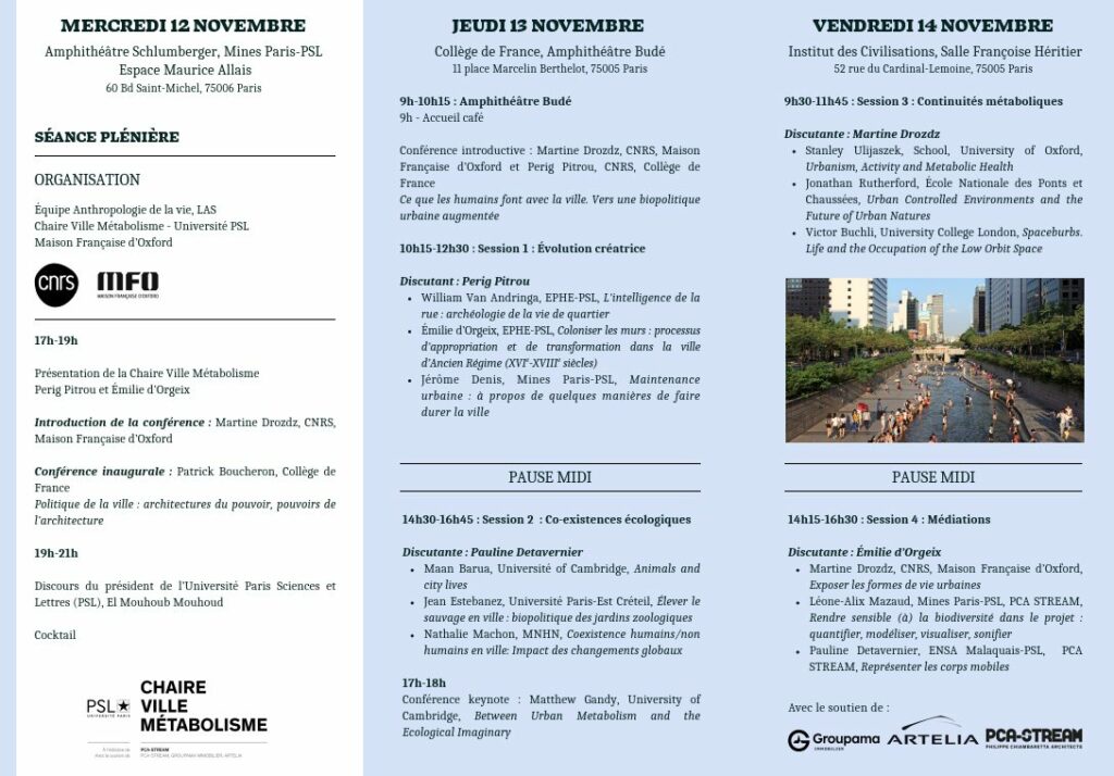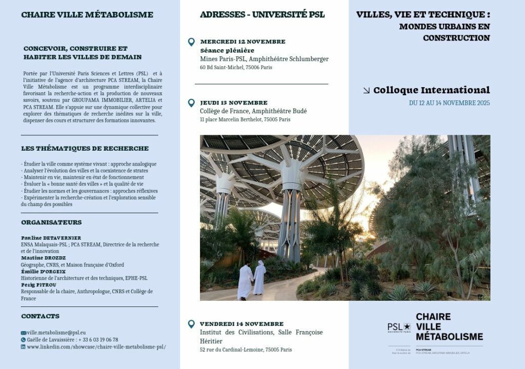Nous avons le plaisir de partager le programme du colloque « Ville, vie et techniques : mondes urbains en construction » qui se tiendra au Collège de France & à l’Institut des Civilisations les jeudi 13 et vendredi 14 novembre et dont vous trouverez, ci-dessous, le programme. Ce dernier est également disponible ici.