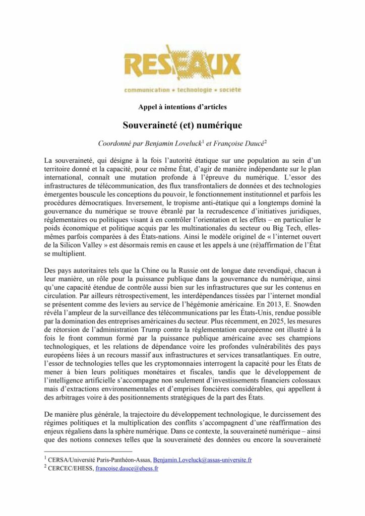 La revue Réseaux lance un appel à intentions de contribution pour le numéro thématique « Souveraineté (et) numérique », coordonné par Benjamin Loveluck et Françoise Daucé.