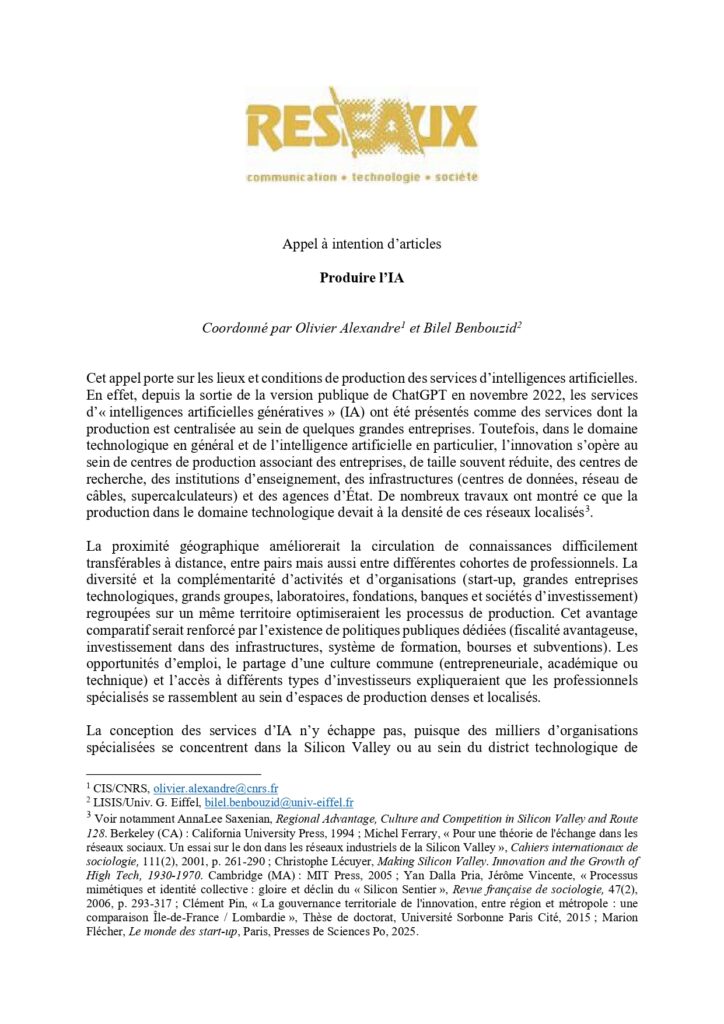 La revue Réseaux lance un appel à intentions de contribution pour le numéro thématique ayant pour sujet « Produire l’IA ». Ce numéro est coordonné par Olivier Alexandre et Bilel Benbouzid.