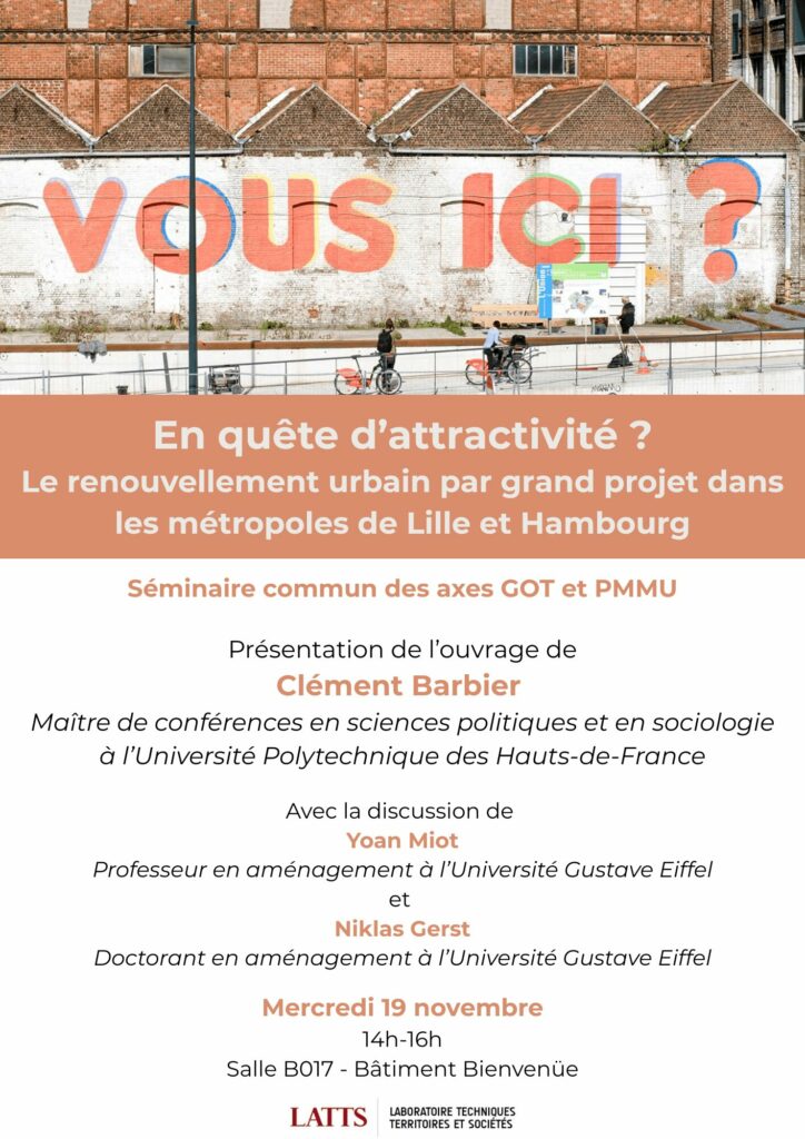 L’invité sera Clément Barbier, Maître de conférences en sociologie et science politique à l’Université Polytechnique des Hauts-de-France. Il présentera son ouvrage En quête d’attractivité. Le renouvellement par grand projet dans les métropoles de Lille et Hambourg. Celui-ci sera discuté par Yoan Miot et Niklas Gerst.